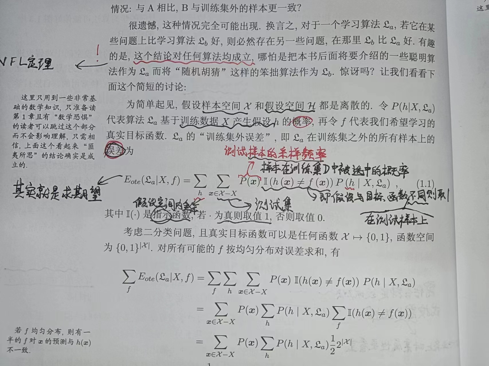 任意算法的“训练集外误差”相等,即不同算法的误差期望相同,无绝对意义上的更优算法。
